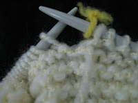 Os marcadores feitos com fio amarelo (mais claros que a tonalidade da peça) separam uma sequência [de pontos] da próxima repetição; assim, a volta ficou colorida, rs, com 10 pontos, marcador amarelo, 10 pontos, marcador amarelo, 10 pontos, marcador amarelo...